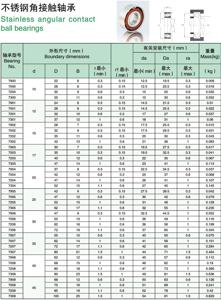 不銹鋼角接觸球軸承可同時承受徑向負荷和軸向負荷。能在較高的轉(zhuǎn)速下工作。接觸角越大,軸向承載能力越高。接觸角為徑 向平面內(nèi)球和滾道的接觸點連線與軸承軸線的垂直線間的角度。高精度和高速軸承通常取15度接觸角。在軸向力作用下,接觸角會增大。